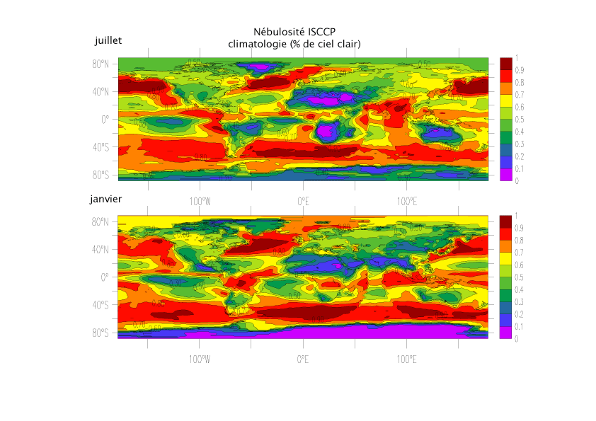 Figure 2: Nébulosité à la surface. Moyennes climatologiques de Juillet et Janvier. Données satellites. Source: International Satellite Cloud Cover