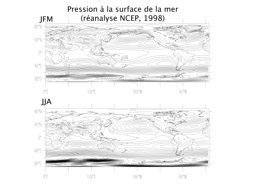 Figure Figure 1.3 . Pression à la surface. Moyennes climatologiques de Janvier-Février-Mars et Juin-Juillet-Aout.