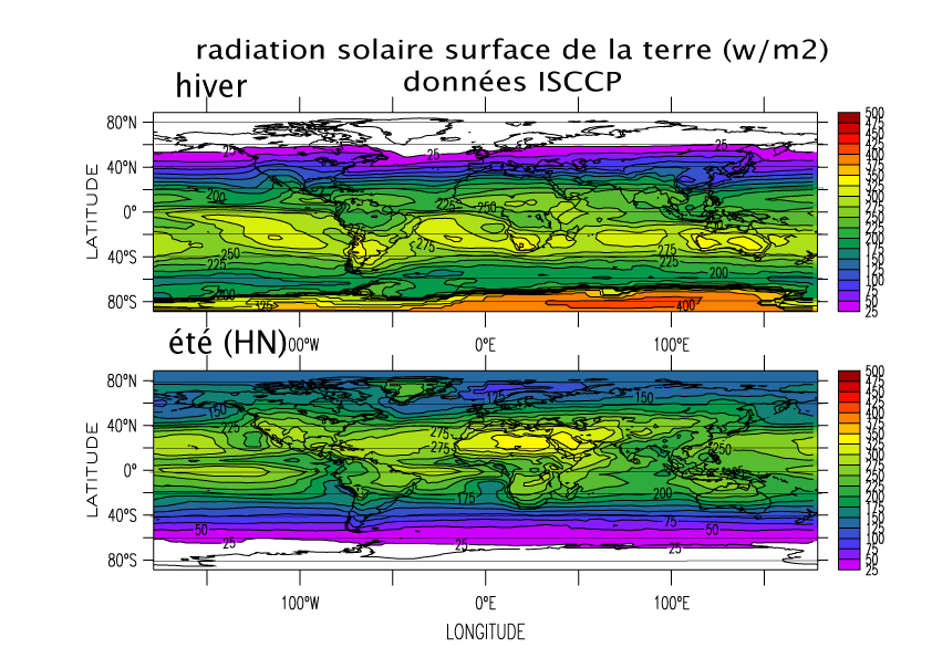 Exercice 1.1.3: Determiner la loi de Lambert et de celle de l'épaisseur atmosphérique perçue, en fonction de la latitude (on s'aidera de l'angle "latitude+saison"), représenter la distribution de l'énergie solaire ayant traversé l'atmosphère, sur une carte en fonction de la longitude et la latitude, en hiver et en été.