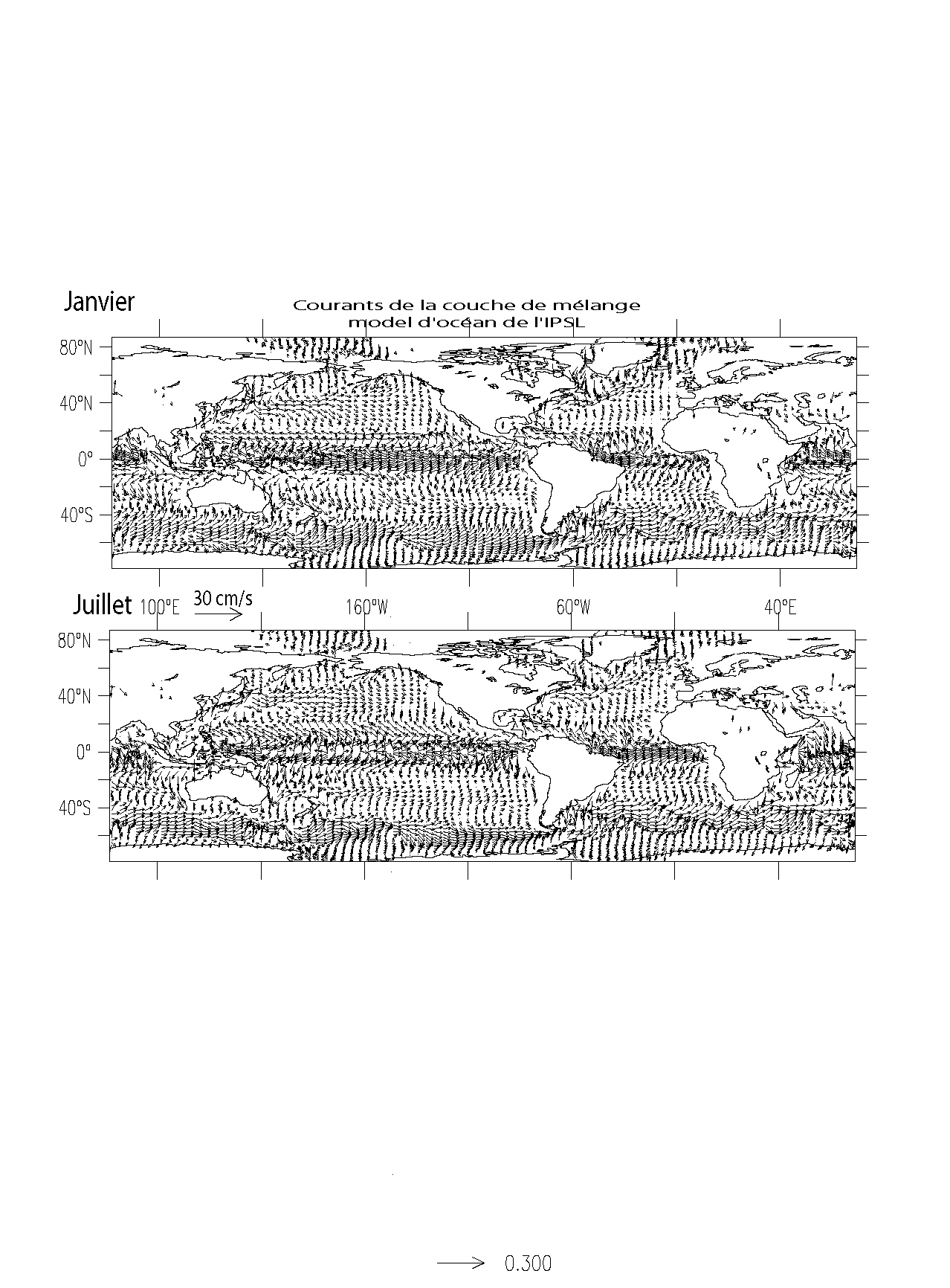 Exercice 2.1.2: Comparer vos estimations avec le champs de courant total dans la couche de mélange du modèle d'océan de l'IPSL figure 2.1.2, et interpreter les différences en considérant, comme pour la géostrophie, les variations de la force de Coriolis.