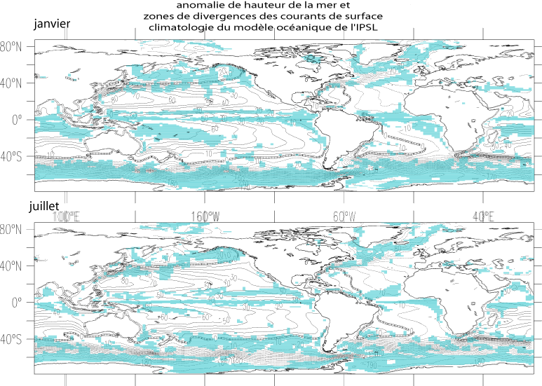 Exercice 2.3.2: Comparer avec vos estimations, puis commenter et interpreter les cartes de divergence et d'élévation de la mer (par rapport au niveau zéro) simulées par le modèle d'océan de l'IPSL figure 2.3.2.