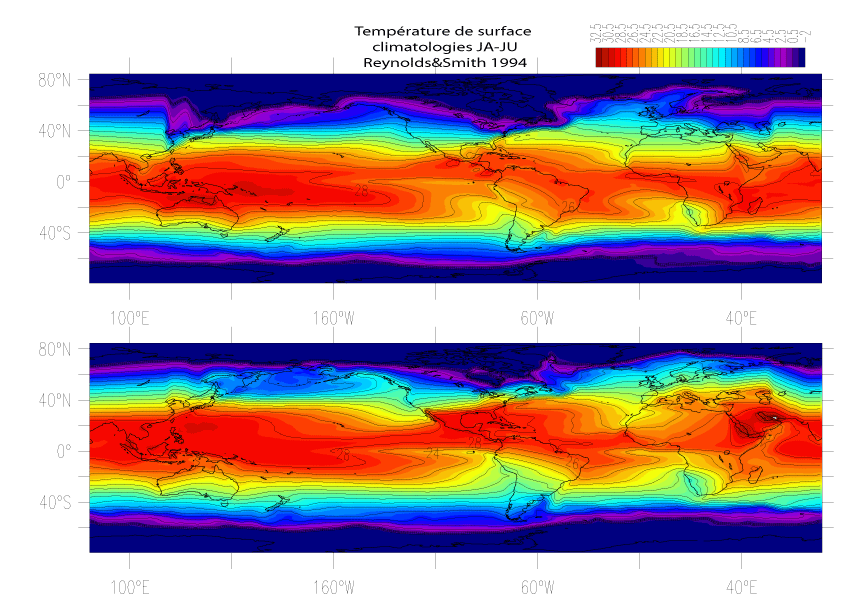 Exercice 2.4.1: Discuter les cartes climatologiques de distribution de température, figure 2.4.1(janvier et juillet, N.B. les températures continentale sont erronnées) en fonction de ces facteurs, notamment la latitude et les upwellings.
